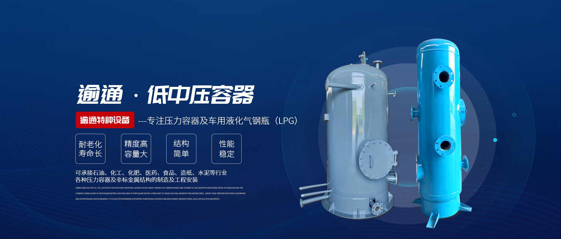河南逾通特種設(shè)備有限公司為國(guó)內(nèi)壓力容器及車(chē)用液化氣鋼瓶(LPG)制造企業(yè)之一??沙薪邮?、化工、化肥、醫(yī)藥、食品、造紙、水泥等行業(yè)各種壓力容器及非標(biāo)金屬結(jié)構(gòu)的制造及工程安裝,是一個(gè)快速發(fā)展的民營(yíng)股份制企業(yè)?! 」咀?cè)資金2506萬(wàn)元,具有國(guó)家頒發(fā)的一、二類(lèi)壓力容器及車(chē)用液化氣鋼瓶(LPG)制造許可證書(shū),并已通過(guò)ISO9001國(guó)際質(zhì)量管理體系認(rèn)證。 公司資金充足,技術(shù)力量雄厚,具有國(guó)內(nèi)高水平的工藝裝備及種類(lèi)齊全的焊接設(shè)備,在焊接、機(jī)械制造、無(wú)損檢測(cè)、理化檢驗(yàn)等都有高資質(zhì)的技術(shù)人員和焊接技工,具有完善的焊接、金屬切削、沖壓、無(wú)損探傷、理化檢驗(yàn)等加工及檢測(cè)能力?! ≡谛袠I(yè)中,公司不斷為用戶(hù)制造了多種具有國(guó)內(nèi)高水平的化肥、醫(yī)藥、化工等行業(yè)的成套設(shè)備。近年來(lái)公司先后為山西天脊集團(tuán)、永煤集團(tuán)、河北裕泰實(shí)業(yè)集團(tuán)、山東方明化工有限公司、石家莊焦化集團(tuán)等國(guó)內(nèi)工程提供了高質(zhì)量的產(chǎn)品,受到了廣大用戶(hù)的好評(píng)?! 」具€專(zhuān)注于車(chē)用液化氣鋼瓶(LPG)及空氣炮(空氣助流器)的制作加工并已擁有了十多年的生產(chǎn)經(jīng)驗(yàn).可為用戶(hù)提供多種型號(hào)的設(shè)備設(shè)計(jì)制造。另外公司對(duì)外承攬空氣炮炮體加工?! 〗窈?,我們將在“以人為本”的管理念下,以團(tuán)結(jié)、嚴(yán)謹(jǐn)、務(wù)實(shí)的工作作風(fēng)堅(jiān)持自主創(chuàng)新、不懈努力發(fā)展,為用戶(hù)制造出價(jià)格更優(yōu)惠,質(zhì)量更可靠的產(chǎn)品。
